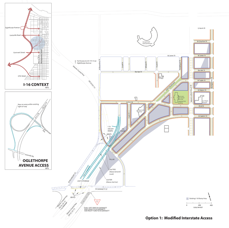 Two options for modifying access to I-16 have been developed for the Interchange Modification Report (IMR) based on the Civic Master Plan. Both options include new ramps to US 17 at Oglethorpe Avenue, which connects with I-16. These new ramps would allow drivers to both enter and exit the highway system at Oglethorpe Avenue from US 17 northbound and southbound (current access is limited to an exit from US 17 southbound or entrance to US 17 northbound).